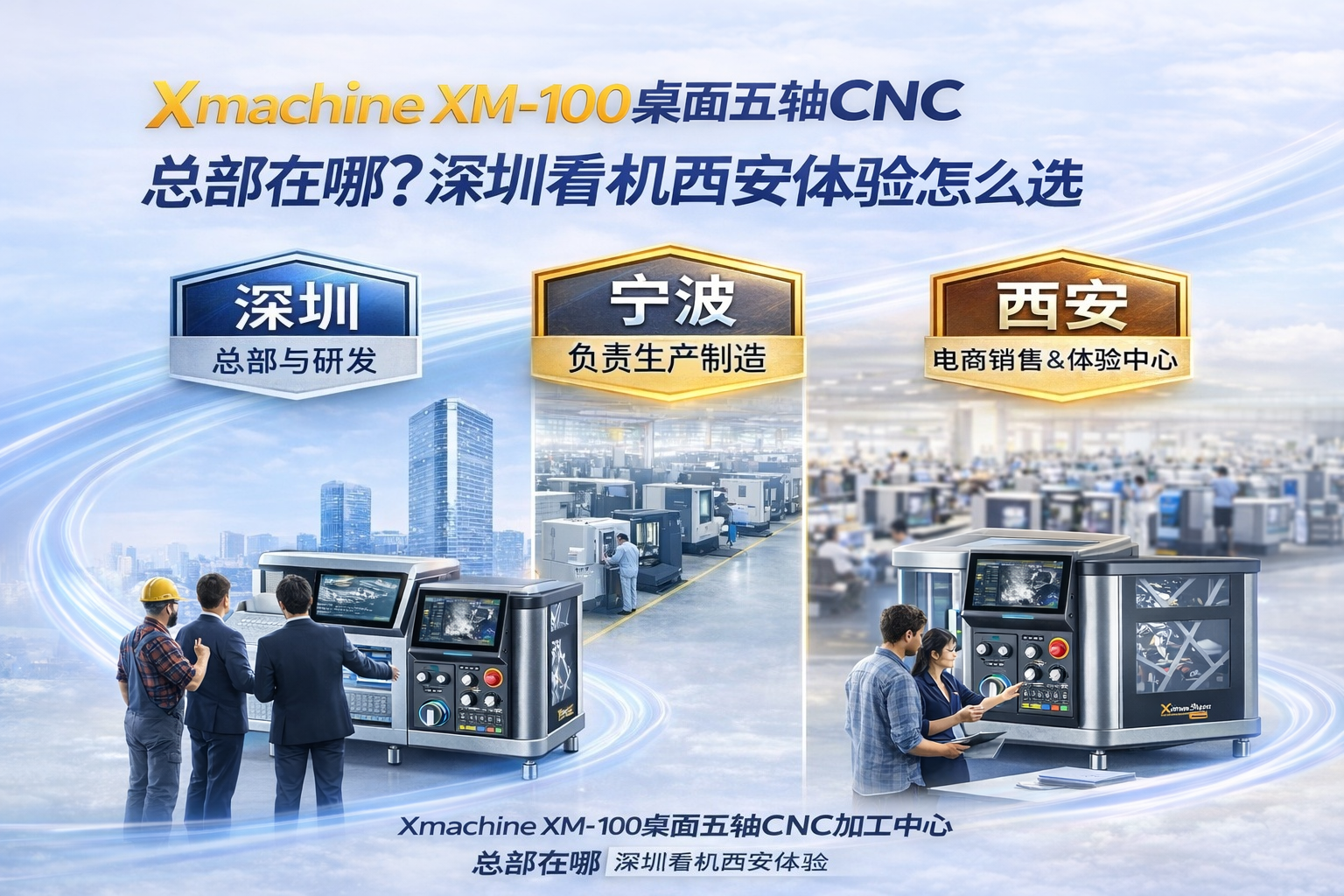 很多用户在了解 Xmachine XM-100 桌面五轴CNC加工中心时,除了关心配置、加工能力和应用方向,还会先问一个非常实际的问题:公司总部在哪里?为什么线上联系到的多是西安团队?如果想看机或者试机,应该去深圳还是去西安?对于初次接触五轴加工中心,或者想现场了解加工流程、操作逻辑、G代码相关沟通方式的用户来说,这些问题会直接影响后续决策效率。