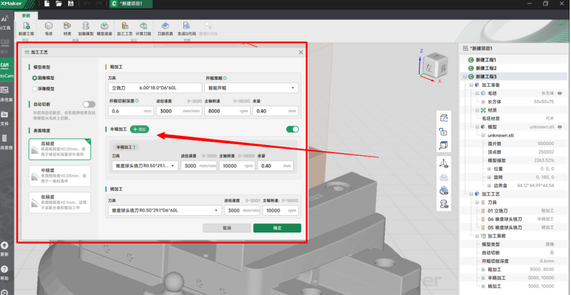 - 支持多次添加半精加工在模型加工工艺调整中,您现在可以多次添加半精加工工序,并为每次工序独立设置不同的加工余量,使工艺规划更加精细灵活。